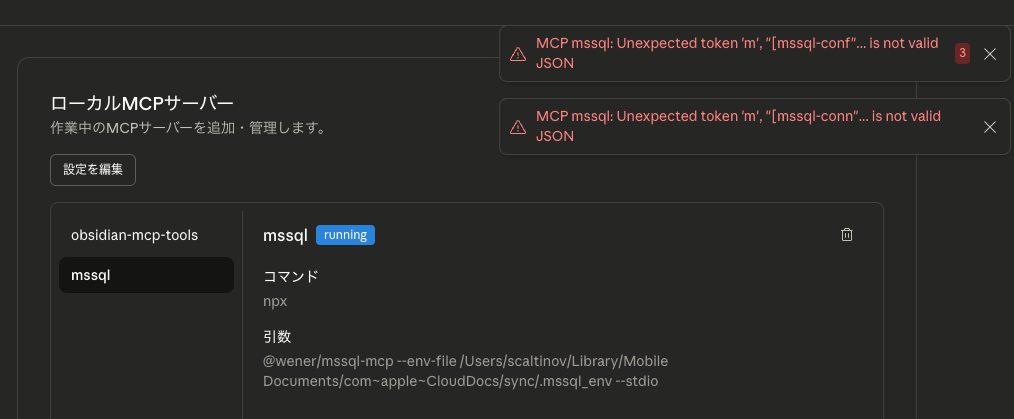 MSSQL_PASSWORD=your_passwordClaude Desktopを再起動する